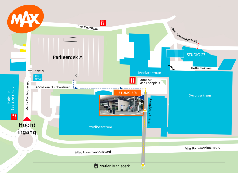- Wordt u door een (touring)bus afgezet, volg dan vanaf de hoofdingang van het Mediapark de Media Parkboulevard, tot parkeerplek A. Sla vanaf het parkeerdek de André van Duinboulevard op en volg de weg tot de ingang van Studio 5/6.