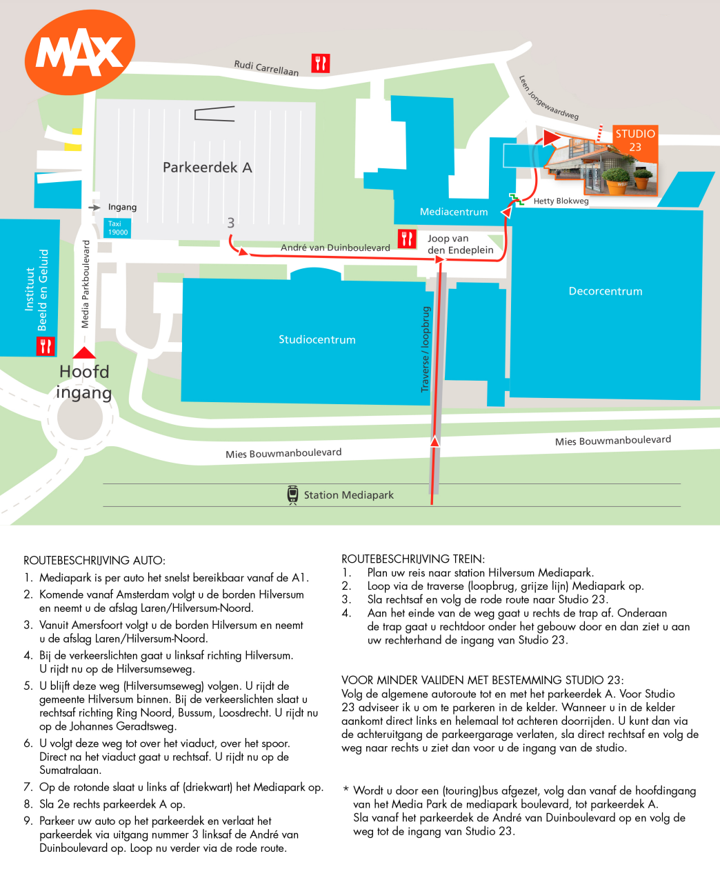 Het Media Park is per auto het snelst te bereiken via de A1: komend vanaf richting Amsterdam neemt u afslag 9 Laren/Hilversum. Vanaf richting Amersfoort volgt u de borden Hilversum-Noord en neemt u afslag 9 Laren/Hilversum-Noord. Bij aankomst op het Media Park volgt u de borden naar de parkeergarages en -terreinen.